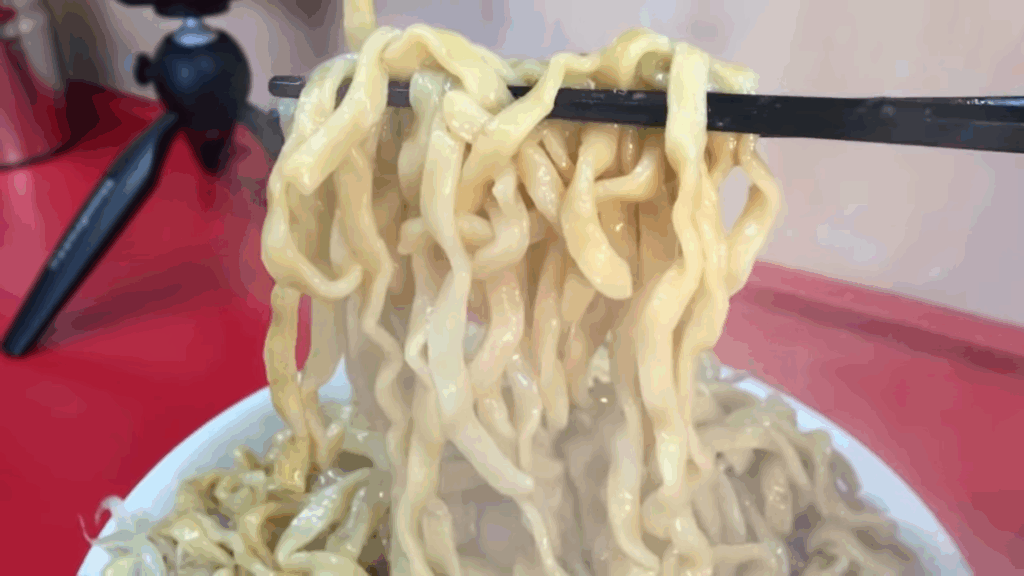 麺は、非常に太く食べ応えのあるタイプで、ガッシリした食感を目指した設計とされており、特に汁なしの際には麺の主張が前面に出る仕様になっています。