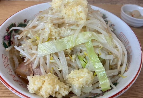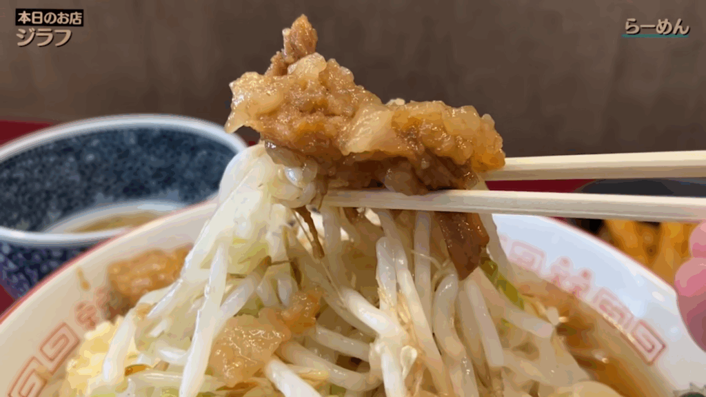 まずはアブラとヤサイから。醤油ダレで程よく味付けされたアブラのコクとシャキっとしたヤサイの食感が相性抜群で、一口目からインパクトのある旨さです。