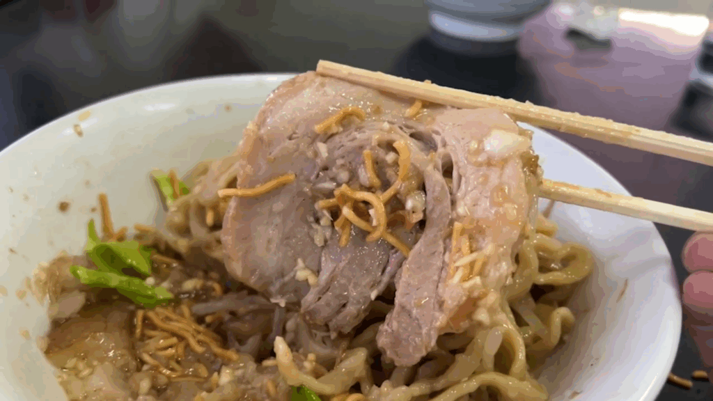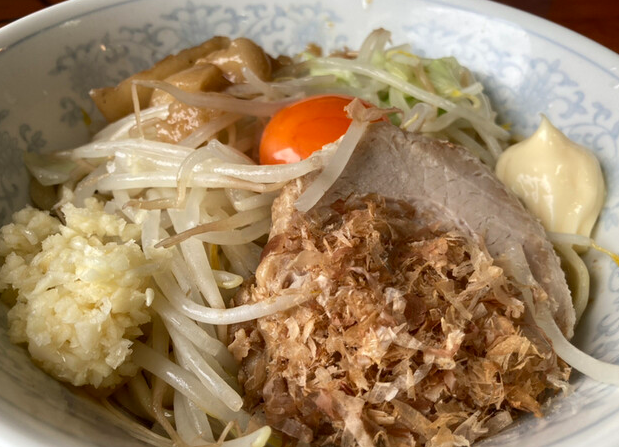 ニンニクやアブラ、かつお節、ベビースターなどが一体となり、極太の手打ち麺からは豊かな香りが立ち上ります。混ぜ終えたところで豪快にすすれば、ムチっとした密度のある食感と、小麦の風味を存分に楽しめる麺の存在感が際立ちます。醤油感のあるタレは塩分の角が立たず、旨味たっぷりで麺と絶妙に絡み合い、バランスの取れた仕上がりです。