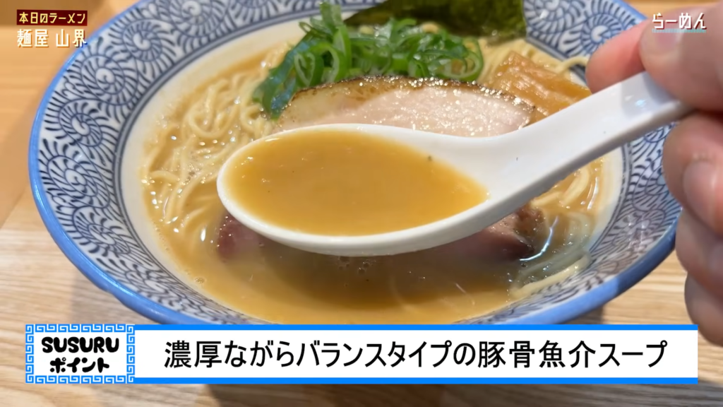 豚骨と鶏ガラをベースに、魚介系の出汁をブレンドした濃厚なスープで、このスープは、旨味が凝縮されており、濃厚ながらもバランスの取れた味わいです。