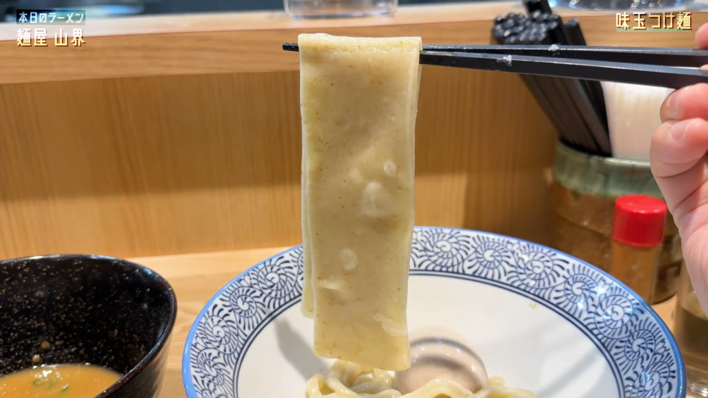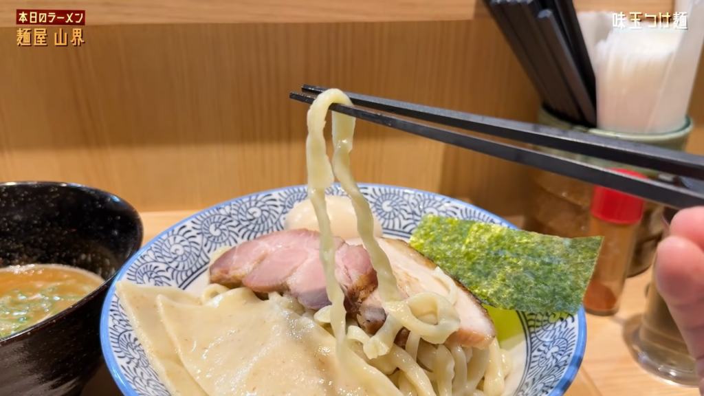 こちらが「麺屋 山界」さんの味玉つけ麺です!極太の手打ち麺が主役として圧倒的な存在感を放つビジュアル!それではいただきます!