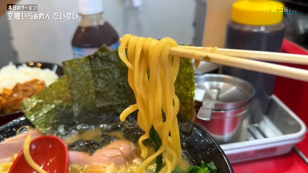 続いて麺をリフトして、よっしゃ!すする!中細麺はスープとの馴染みもよく、滑らかなすすり心地でどんどん箸が進む!ネギや海苔と絡めればさらに風味が広がり、安定感のある美味しさです!