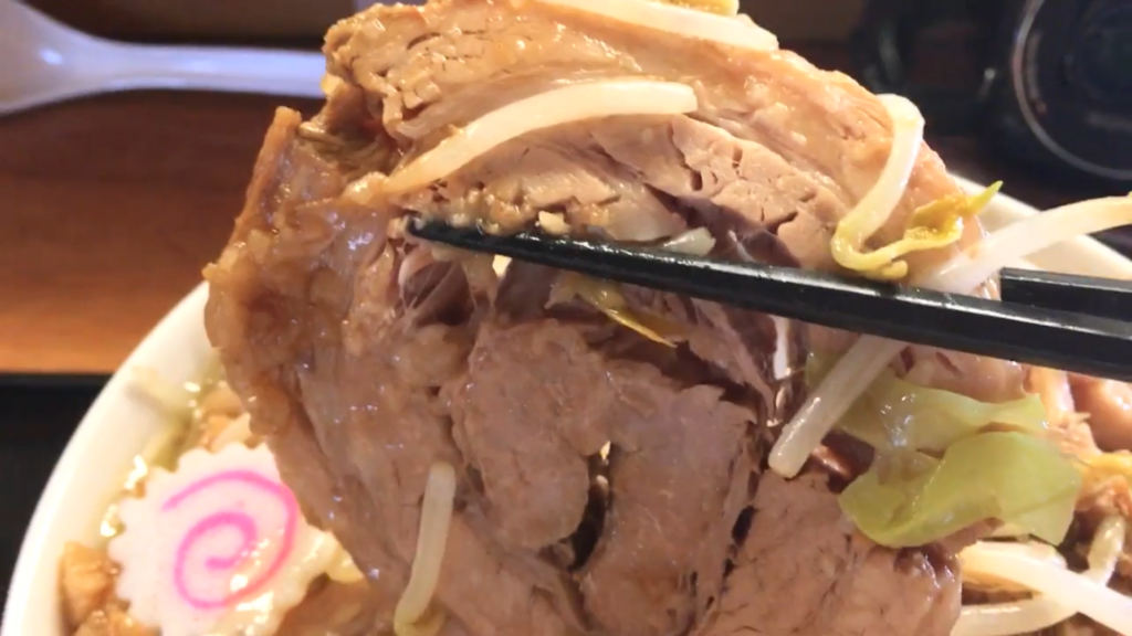 続いて厚みのある豚をひと口。噛んだ瞬間にホロッと崩れる柔らかさで、肉厚なのに重さを感じず食べやすい仕上がり。ヤサイと豚を交互に食べ進めたくなるバランスの良い味わいで、どんどん箸が進みます。