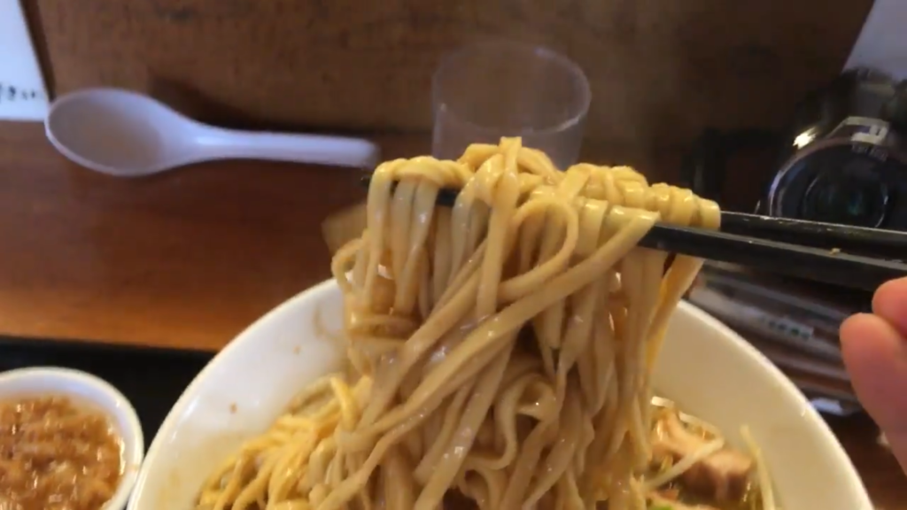 二郎系の麺は、強い弾力を持つ太麺で、もっちりしつつワシワシした噛み応えがあり、食べ応えがしっかりあります。