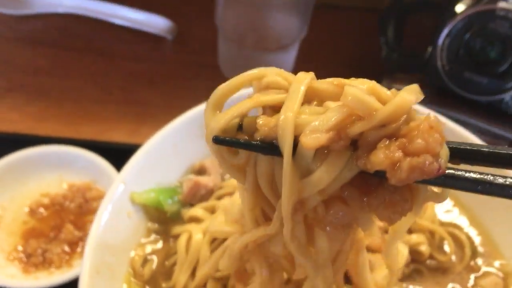 ではいよいよ麺を。独特の平打ち麺を引き上げて、すする!密度がしっかり詰まった麺でコシが強く、うどんのような頼もしさを感じる食べ応え。スープとの絡みも良く、すすりごたえがあります。