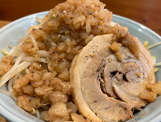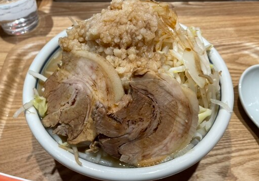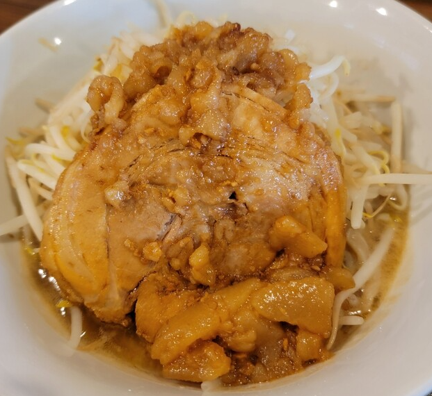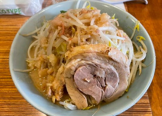 二郎系メニューは、通称“骨太二郎”と呼ばれるような構成で、山盛り野菜と分厚い豚、ニンニクのパンチが効いた仕上がりです。