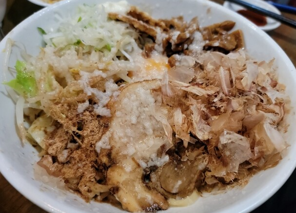 こちらが「アジト」さんの大豚麺、ヤサイ・ニンニク・アブラ全部増しです。