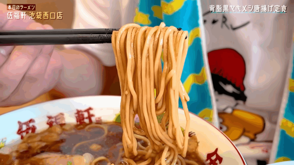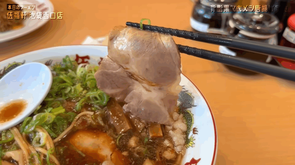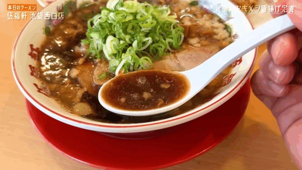 伍福軒の最大の特徴は、なんといっても看板メニューの 「東京背脂黒醤油ラーメン」 です。真っ黒な醤油スープにたっぷりの背脂が浮かび、見た目のインパクトはかなり強め。しっかり濃いめの味ながら、意外と後味はすっきりしていて箸が進みます。
