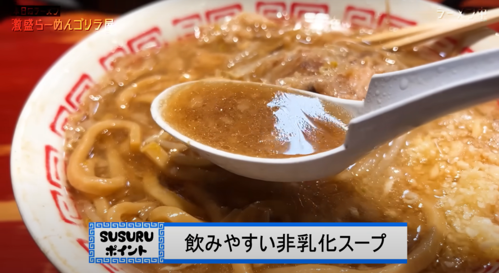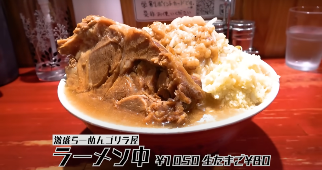 さて、登場したのが「ゴリラ屋さん」のラーメン中と生たまご!まず目を引くのは、デッカデカのブタの塊です。そのボリュームに興奮しつつ、スープとたっぷりのニンニク・アブラも見逃せません。さっそくいただきます!