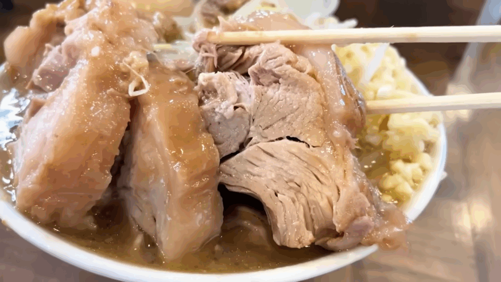 続いて豚をひと口。ほぐれるほど柔らかく仕上がっていて、味染みも抜群。噛むたびに旨味が広がり、ヤサイとの相性も最高です。