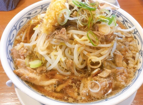 二郎系メニューとして「達郎(たつろう)」があり、山盛りのヤサイと厚切りチャーシュー、たっぷりの背脂がのった迫力満点の一杯で、ニンニクやアブラの量を調整できます。