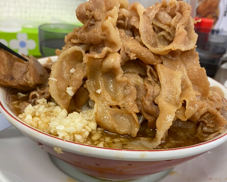 二郎系メニューは、たっぷりの野菜と分厚い豚が乗るガッツリ仕様で、ジャンキーな味わいが特徴です。