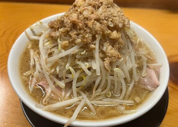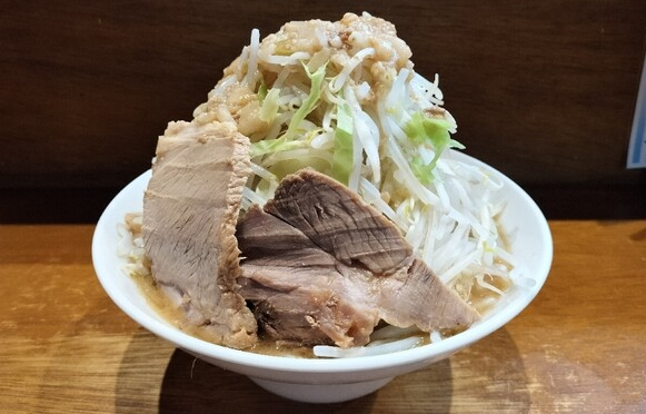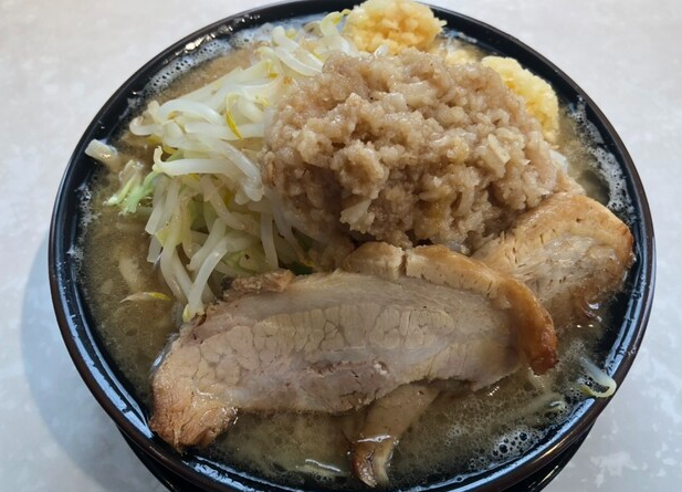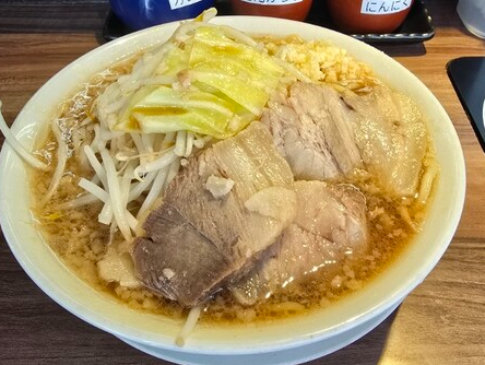 二郎系メニューは「脂醤油ラーメン」が看板で、山盛りのヤサイ、分厚いチャーシュー、そしてたっぷりの背脂がのった圧巻のビジュアルです。