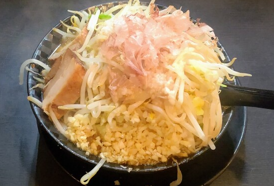 二郎系メニューは「ラーメン」「大ラーメン」「汁なし」などがあり、ヤサイ・ニンニク・アブラ・カラメを好みに合わせてコールできます。