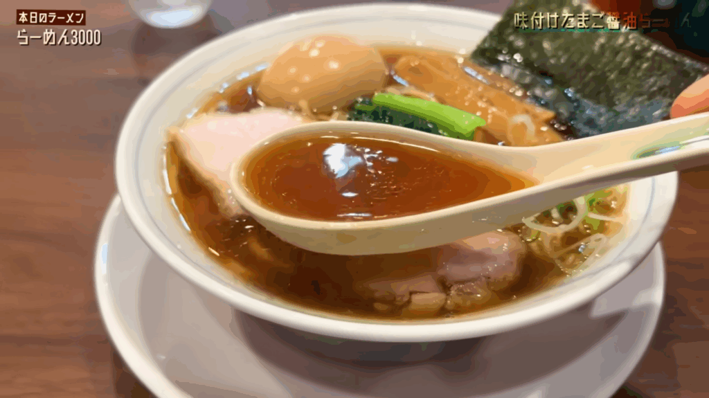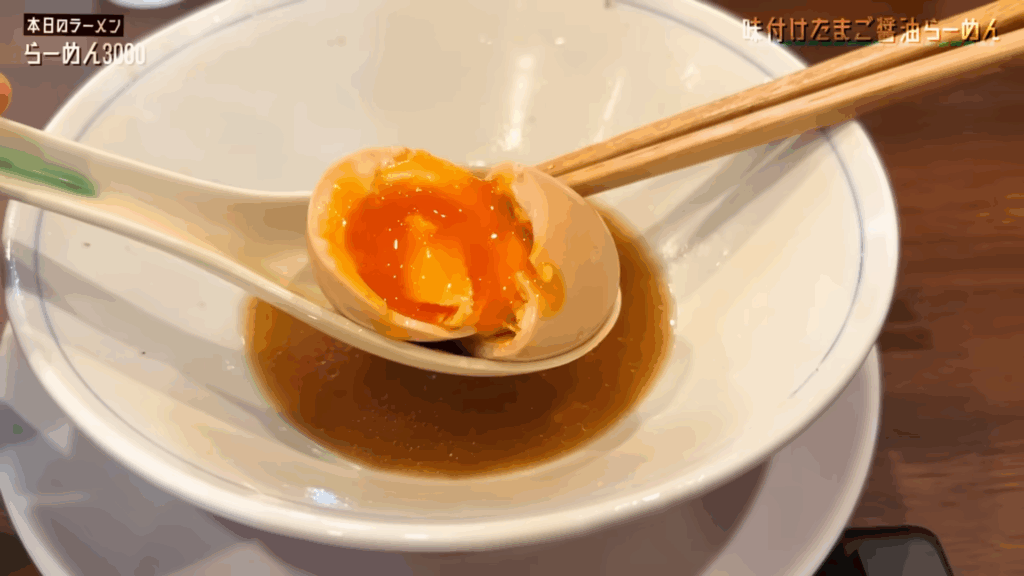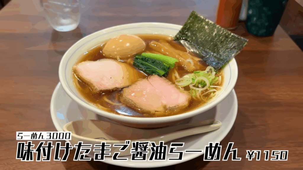 こちらが、「らーめん3000」さんの「味付けたまご醤油ラーメン」です。