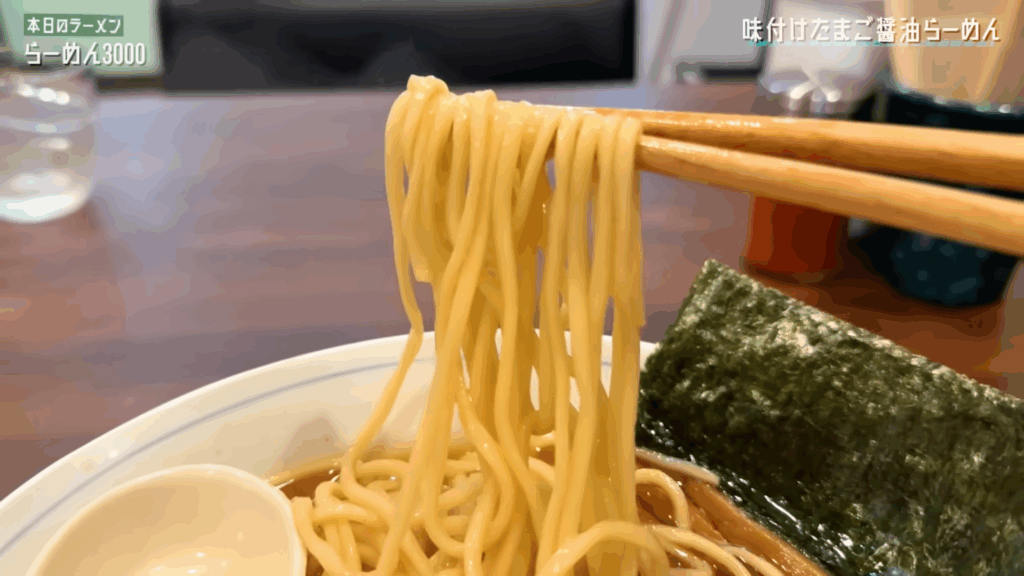 続いて麺を持ち上げ、すすると、丸みのある平打ち気味のストレート麺が軽やかにすすれ、小麦の風味が豊かに広がります。
