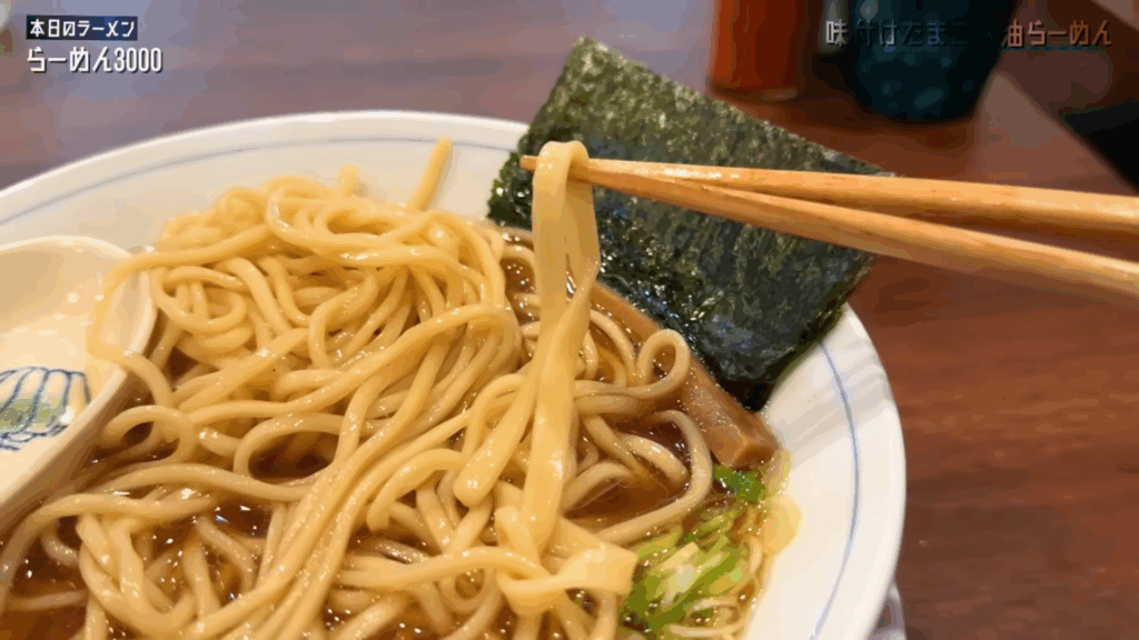 続いて麺をリフト。丸みのある中細麺はすすり心地が軽く、計算された硬さが光る一本で、素朴な印象ながら実力派な仕上がりです。店主さん曰く「昔から作り方を変えていないだけ」とのことですが、その実直さこそが50年以上愛されてきた理由だと感じられます。