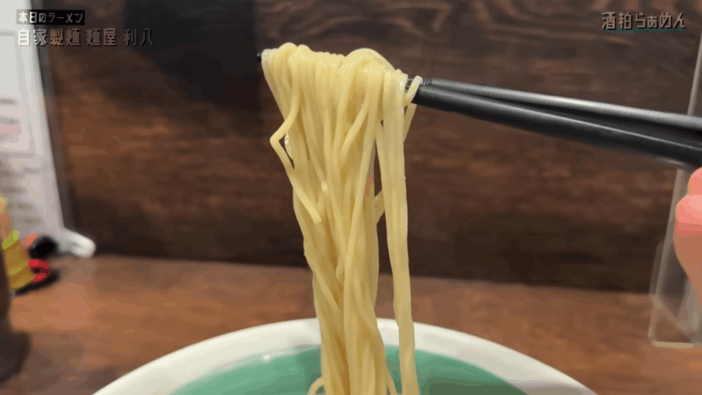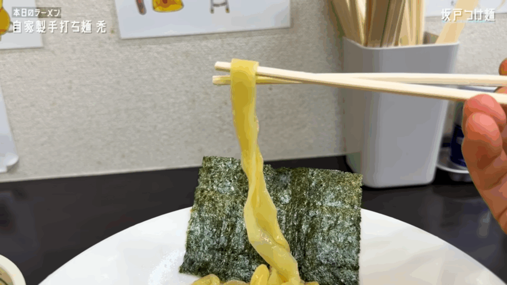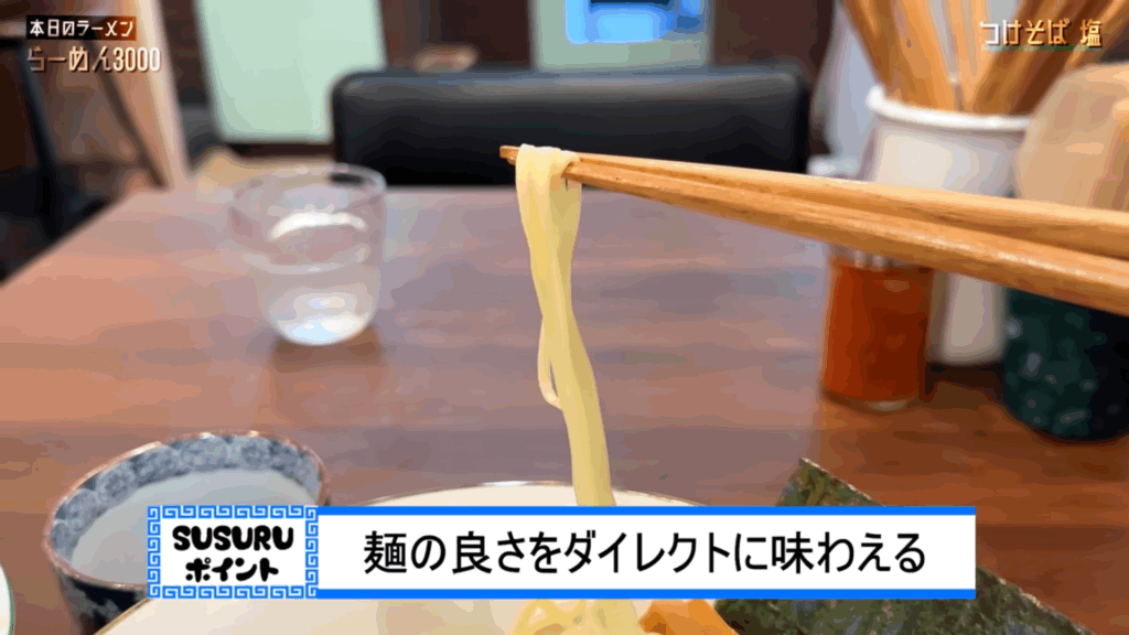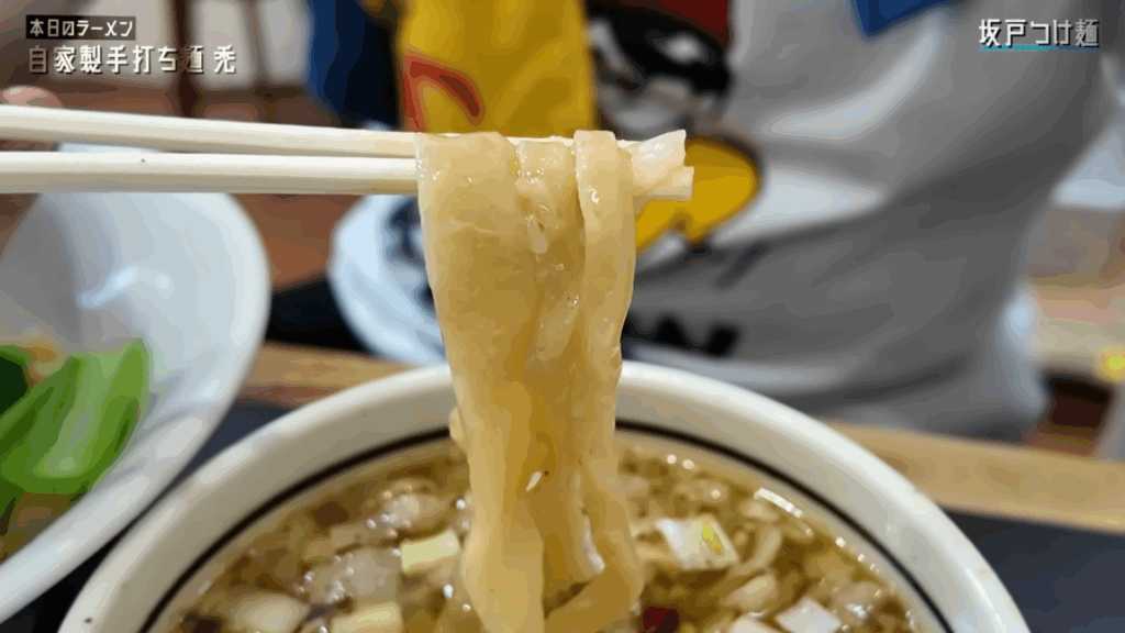 - 太麺をすすってみると、手もみ特有のランダムなウェーブがスープをしっかり持ち上げ、モチモチと存在感ある食感が印象的です!
