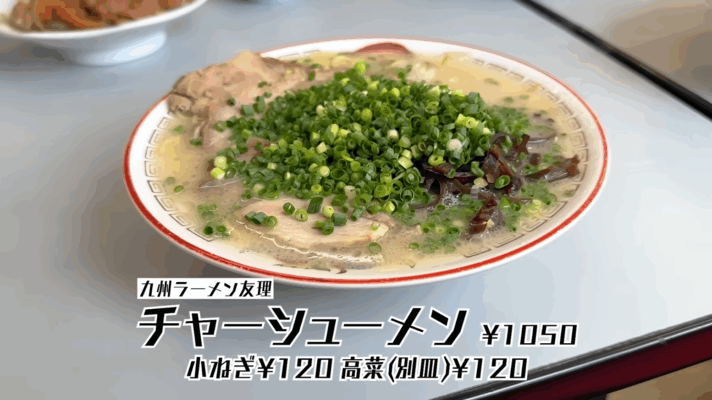 こちらが、「九州ラーメン 友理」さんの「チャーシューメン」「ネギトッピング」「高菜」です!