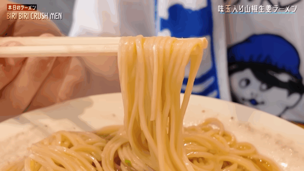 - 中細ストレート麺をすすってみると、ジャストな茹で加減でツルッとしたすすり心地と適度なコシがあり、山椒と生姜が効いたスープによく寄り添います!