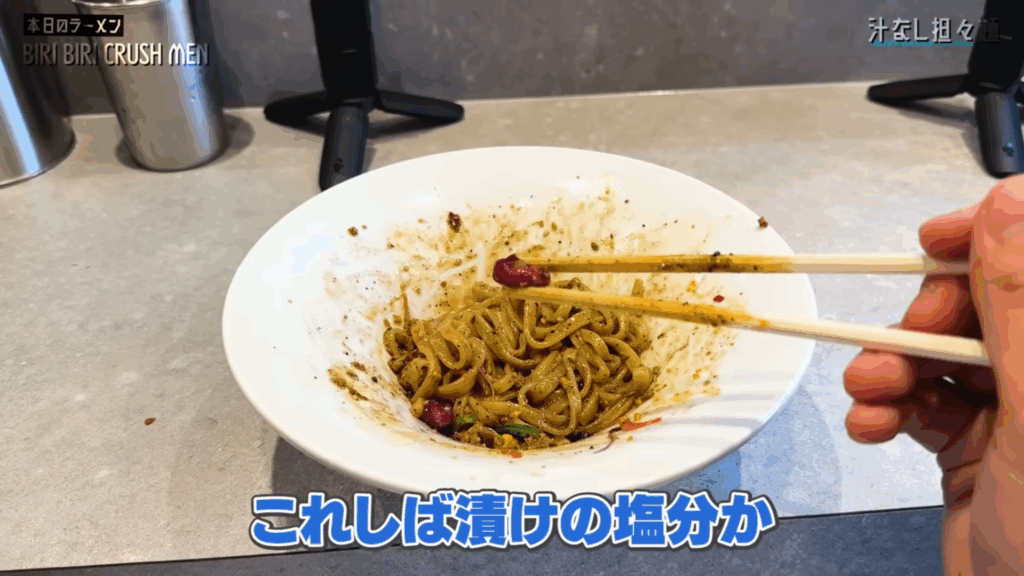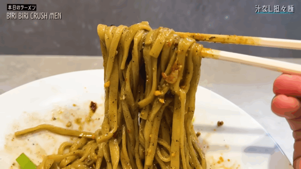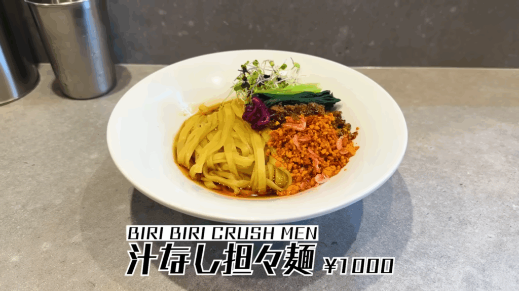 こちらが、「BIRI BIRI CRUSH MEN」さんの「汁なし担々麺」です。平打ちの中太麺に肉味噌、青菜などが美しく並び、食欲をそそる仕上がりです。まずは下からしっかり混ぜ合わせ、麺とタレを一体化させてからすすっていきます。