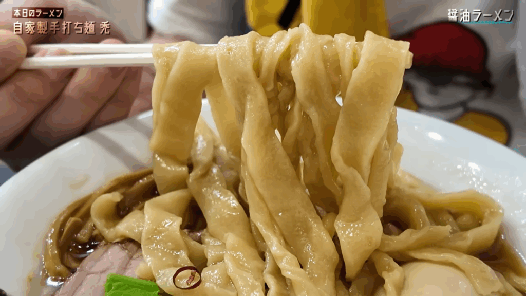 続いて、移転後から加わったという太麺をすすってみると、手もみ特有のランダムなウェーブがスープをしっかり持ち上げ、モチモチと存在感ある食感が印象的です。