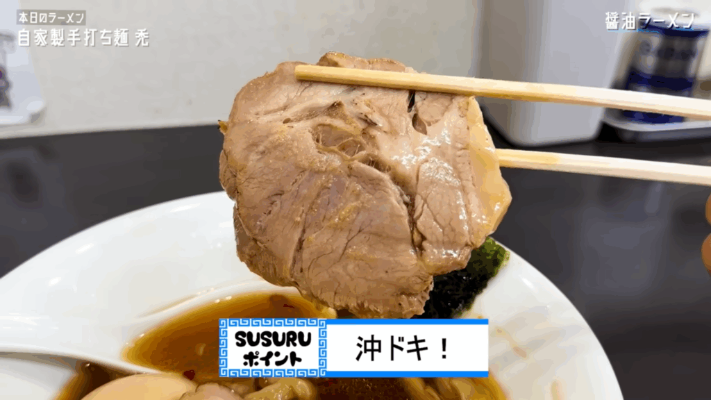 ここで吊るし焼きチャーシューを食らってみると、しっとり柔らかく香り豊かなスモーク感が特徴で、味付け・低温調理・スモークの三工程が生む奥行きがスープの旨味をさらに引き立てます。