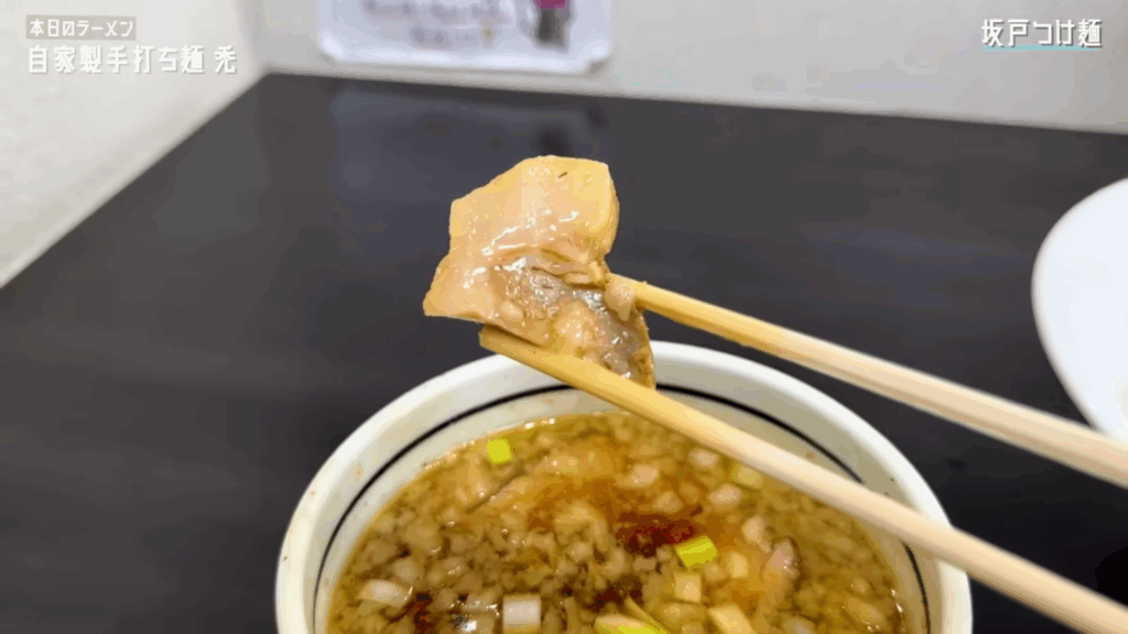 つけ汁側のチャーシューも加えてさらに濃厚な味わいに。こちらもたっぷり入っていて嬉しいポイントです。