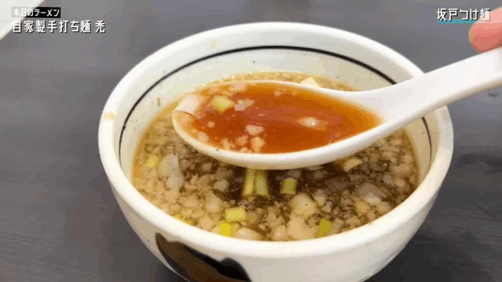 最後にスープ割りをお願いすると、これが驚くほど美味しく、つけ汁の強さに魚介出汁の厚みが加わって一気に調和の取れた絶品スープに。