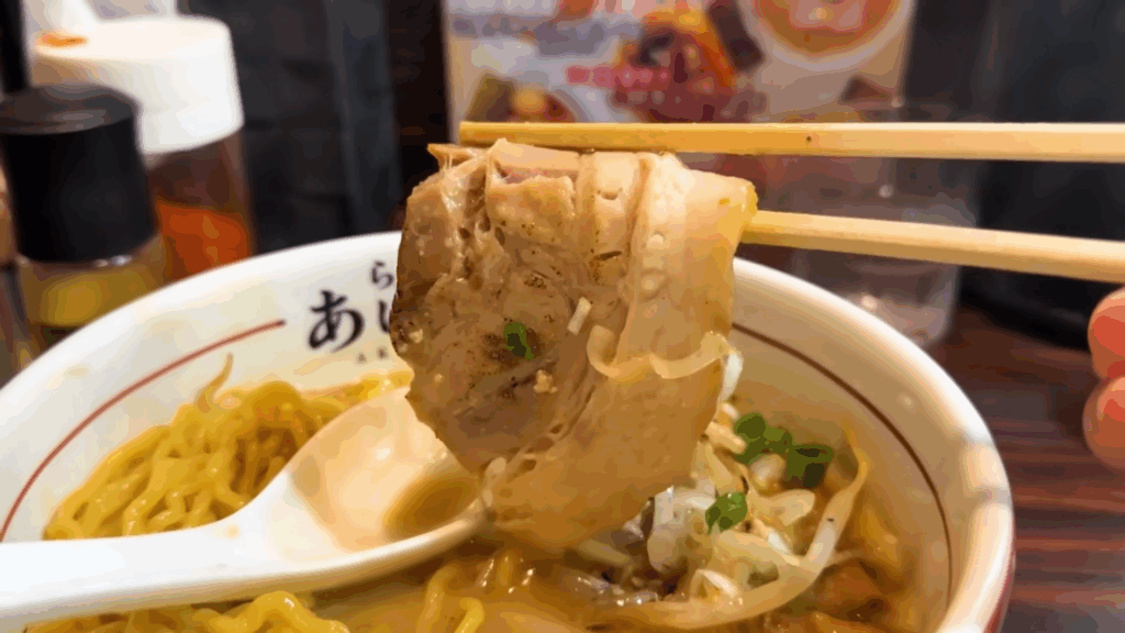 表面に炙り目がついた大判チャーシューは、口に入れた瞬間に脂がとろりと溶け出し、香ばしさと肉の旨味が濃厚味噌スープと見事に調和。炒め野菜のシャキッとした食感も良いアクセントとなり、一口ごとに食欲を押し上げてくれるバランスの良い構成です。