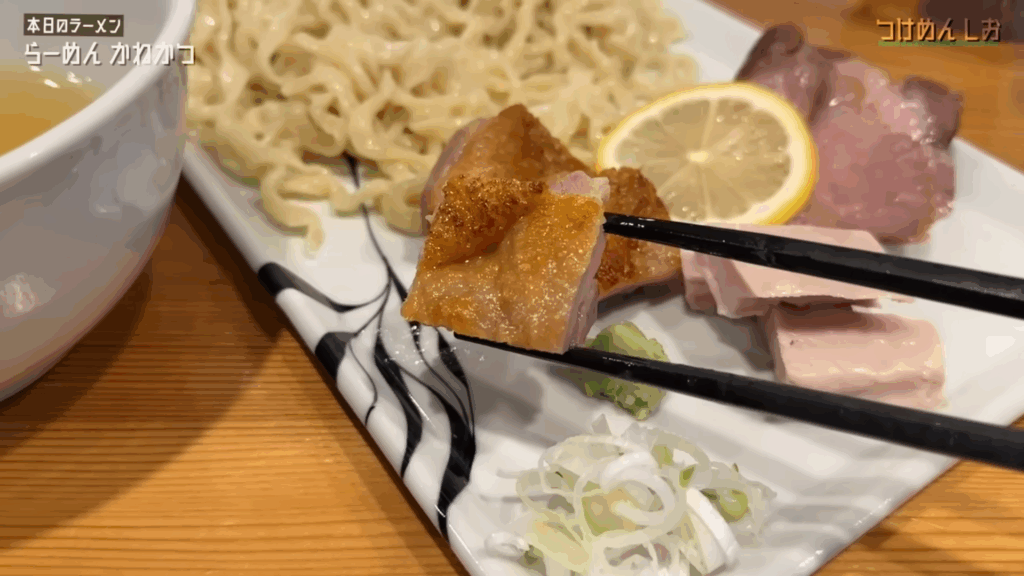 • 鶏チャーシューは、パリッとした皮とジューシーな身のコントラストが抜群で、つけ汁との相性も良好です!