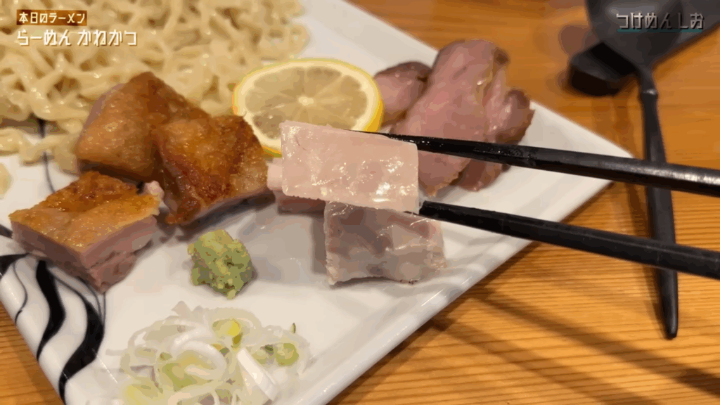 さらにもうひとつの鶏チャーシューは、しっとりと柔らかく、舌触りの滑らかさが際立つ仕上がり。わさびを少し乗せて食べると爽やかさが加わり、つけ汁の後味を軽やかに整えてくれるナイスな組み合わせです。3種類とも個性があり、「肉三昧」はぜひ注文してほしい内容となっています。