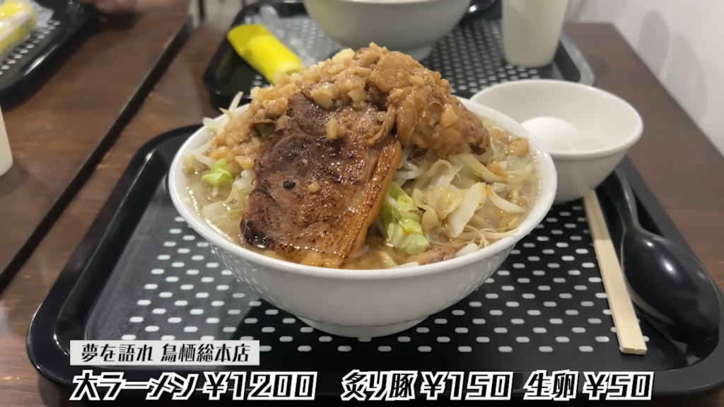 こちらが「夢を語れ 鳥栖総本店」さんの大ラーメン、ヤサイ・ニンニク・アブラ、炙り豚、生卵です。