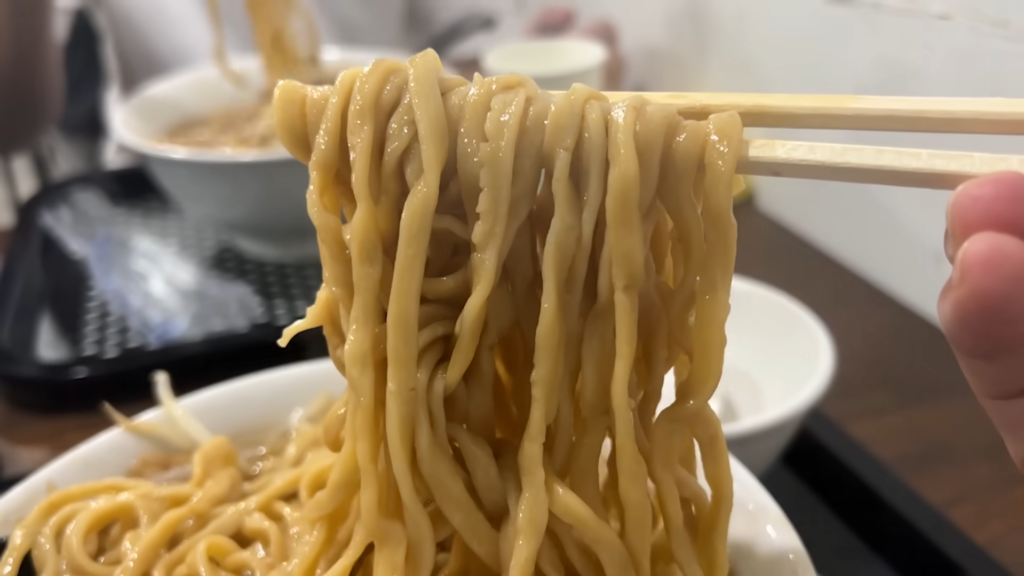 二郎系の麺は、密度が高く噛み応えのある極太麺で、ワシワシとした力強い食感が特徴で、噛むたびに小麦の風味が広がります。