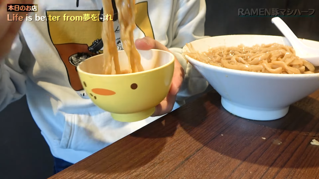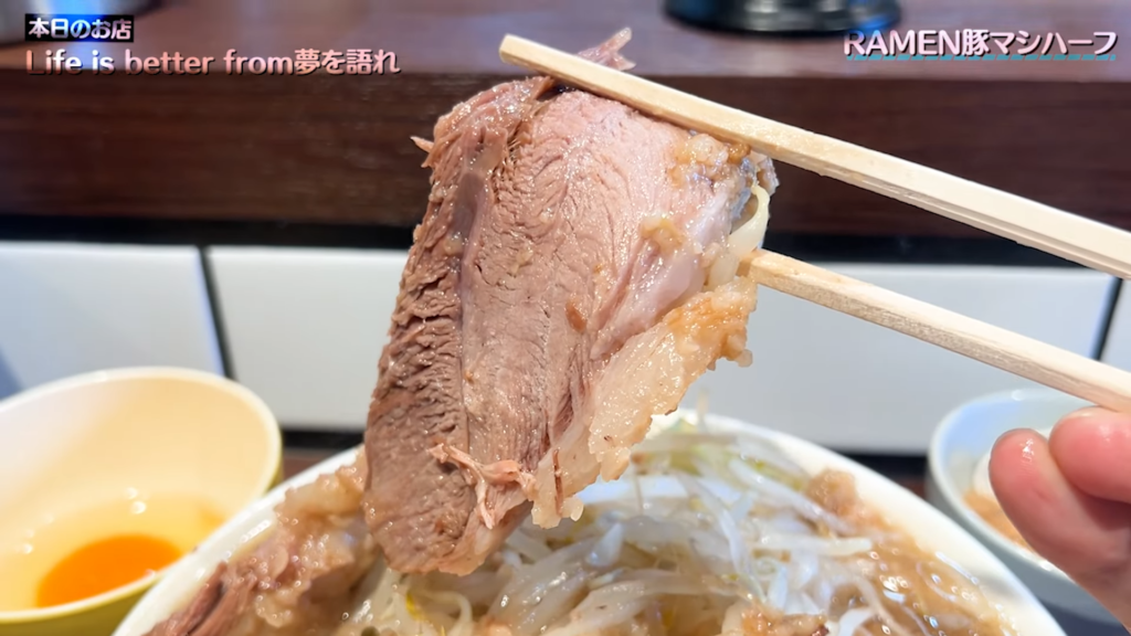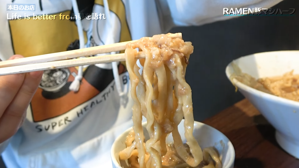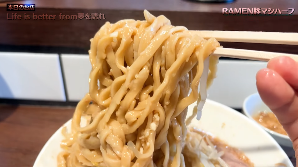 ある程度ヤサイを食べ進めると、いよいよ超極太の自家製麺とご対面!見た目からして明らかに迫力ある麺を引き上げ、よっしゃすする!唇が揺れるほどの極太麺は、もちもちとした食感とみっちり詰まった小麦の風味が特徴的で、食べごたえ抜群。表面はつるっと滑らかで、スープとの絡みも非常に良く、まさに唯一無二の存在感を放っています。