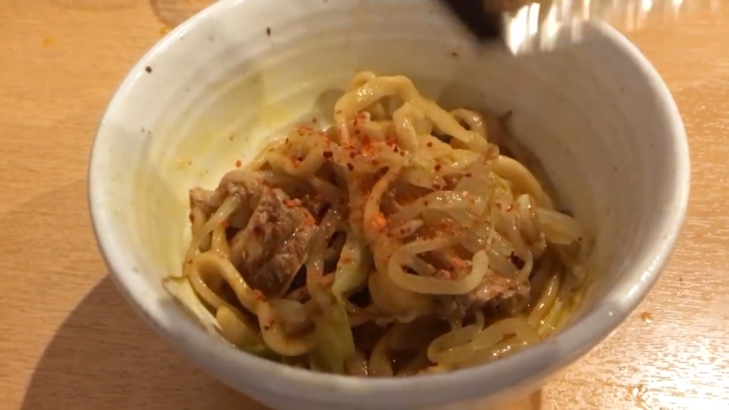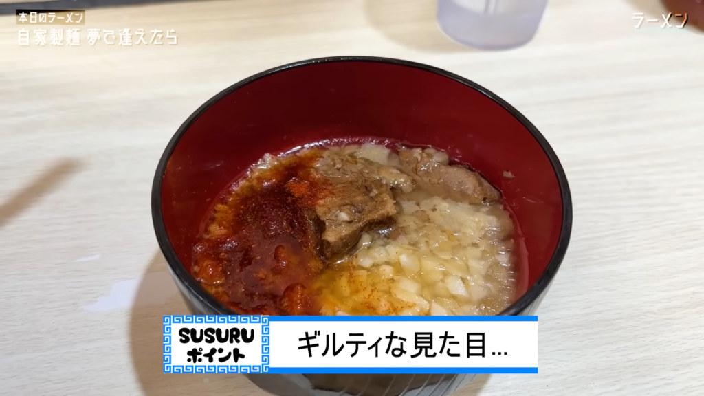 さらに途中、店主さんからサービスで提供された味変アイテム「ギルティ」にもチャレンジ。ブタカスアブラに唐辛子とニンニクを合わせたその名の通りのギルティ仕様で、麺をディップしてすすってみると、刺激とパンチが一気に跳ね上がり、既存のジャンク感をさらに上書きしてきます。生たまごと合わせることで、強烈な攻撃力とまろやかさが共存する意外性のある味わいも楽しめます。