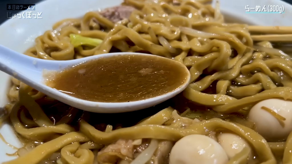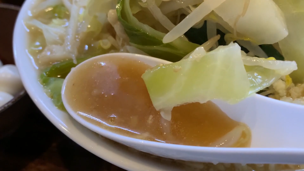 野菜と脂を交互に楽しみながら、次はスープを一口!ぴひー!豚の旨味や野菜の甘味が溶け込んだ深い味わいで、これから麺と絡めるのが楽しみになるスープです!