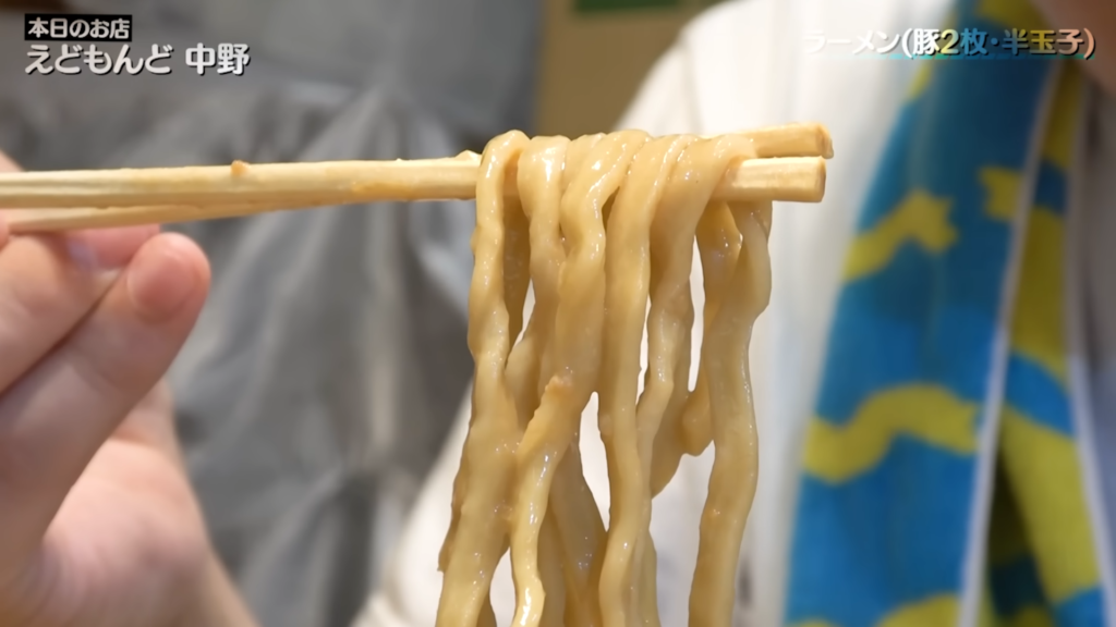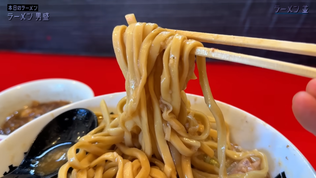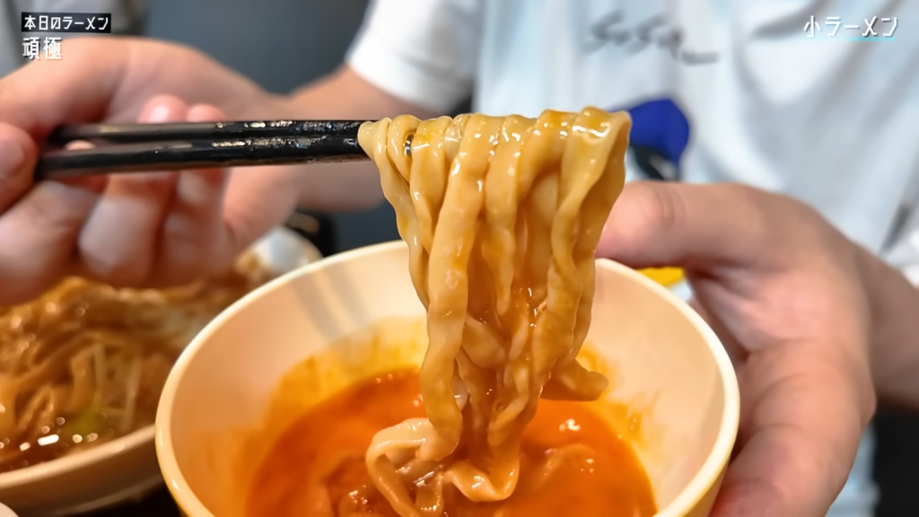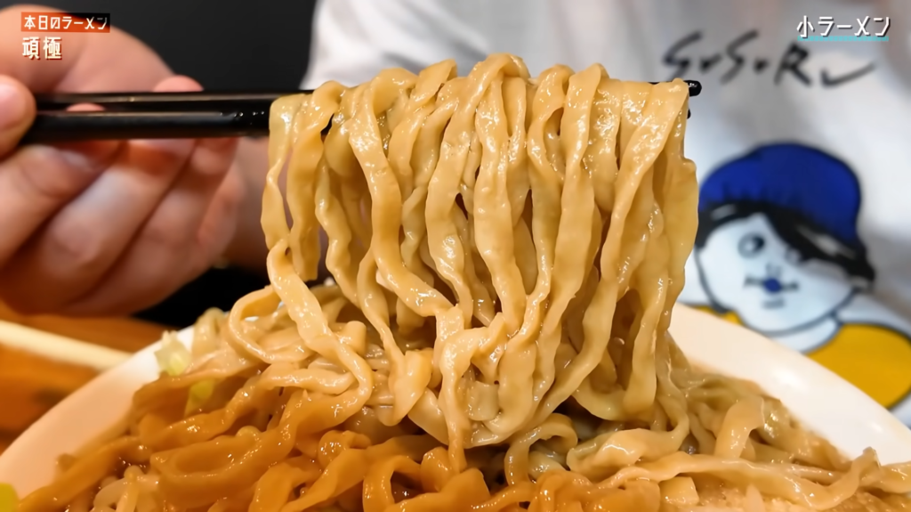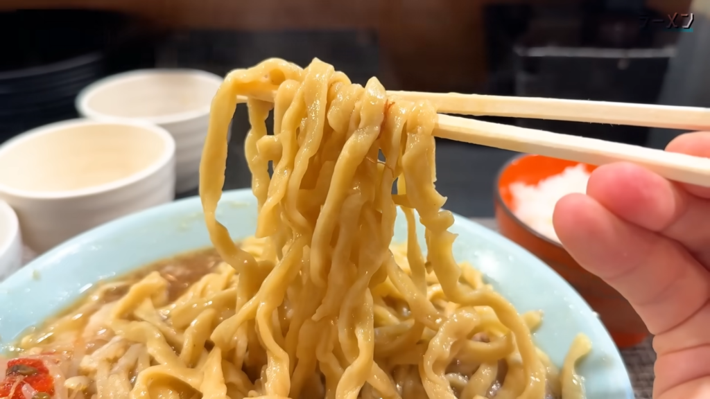 そしていよいよ麺とご対面!平打ち気味の太麺をすする!おらー!表面はニュルンとした滑らかなすすり心地で、スープをしっかり吸い込んだ麺がかなりススル好み!茹で加減は柔らかめで、クニュっとした食感がクセになる!