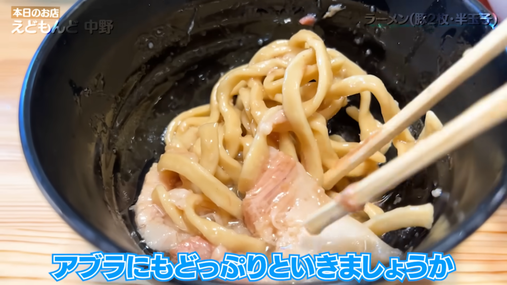 ここで登場したのが生卵!麺をくぐらせてすするだけで卵黄のコクがスープをさらにまろやかにし、極上の味わいに。次は別皿のアブラを絡めてすすれば、パンチの効いたコクと旨味がさらに倍増!ウズラの玉子もパクっと食らい、端豚もガブリと楽しみながら猪突猛進で麺をすすり続けます!