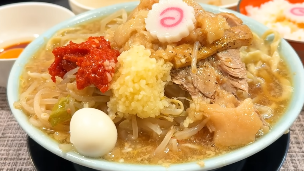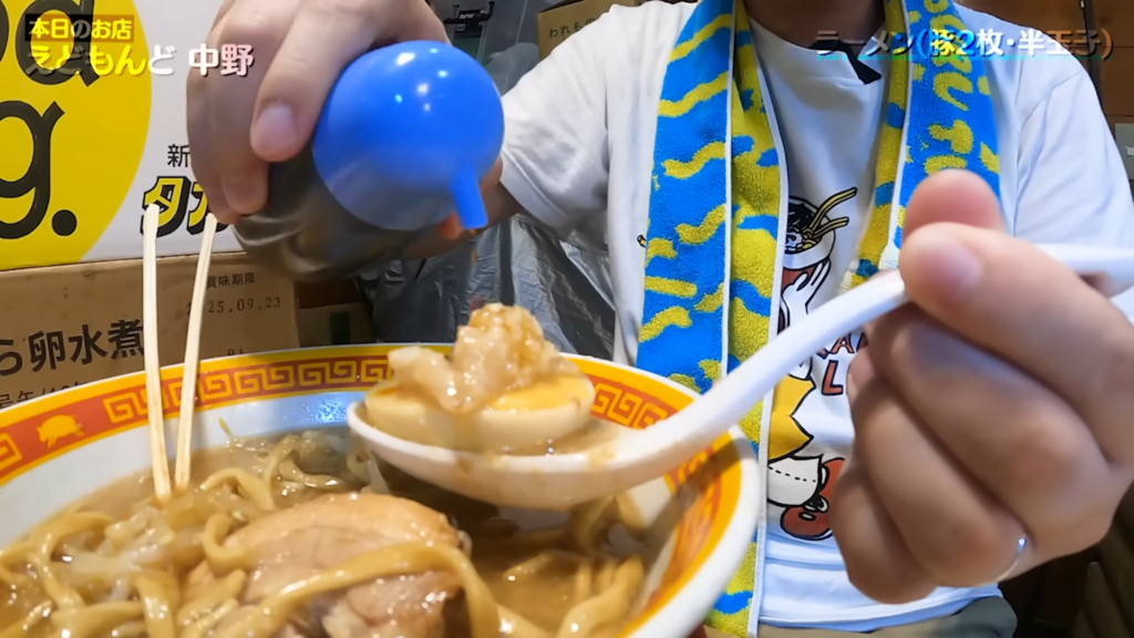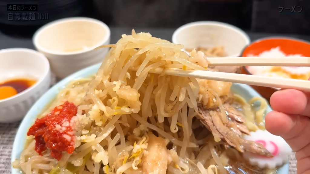 そして、この日のハイライトが「とろり味玉・ラー油」。青森県産のブランド卵「真っ赤卵」を使用した温玉とラー油を絡めて麺をすすってみると、じんわり広がるラー油の辛味とスープの旨味を、ねっとりとした温玉のコクが優しく包み込み、味変として完成度の高い一体感を生み出します。ガツンとした二郎系の中に、しっかりとした奥行きを与えてくれる優秀なトッピングです。