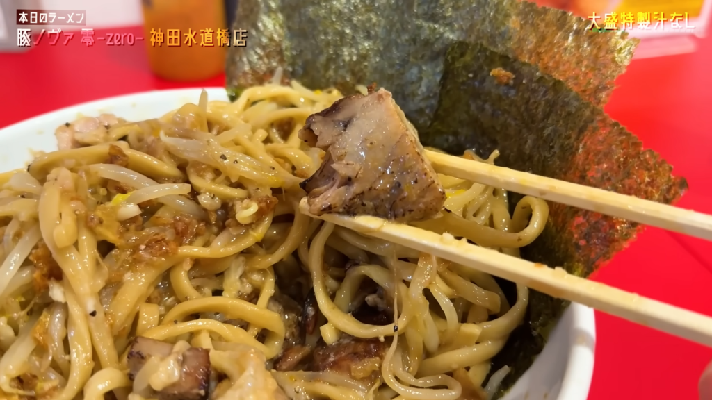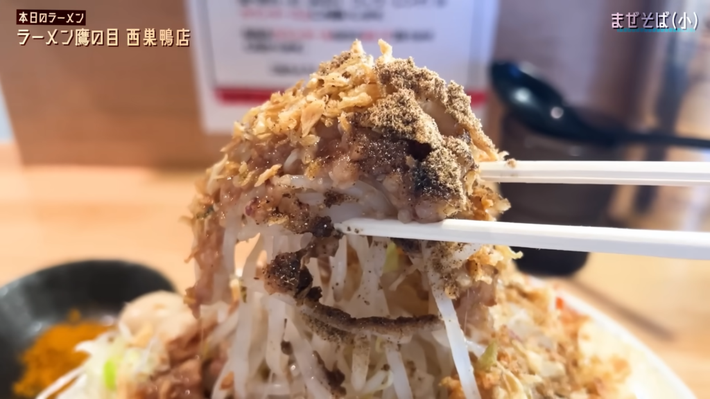 卵黄やマヨネーズ、フライドオニオン、ブラックペッパーなどのトッピングも非常に豊富で、すする場所によって味の表情が変わるのも楽しいポイント。単調になりがちな大盛汁なしでありながら、最後まで変化を楽しみながらリズム良くすすっていけます。