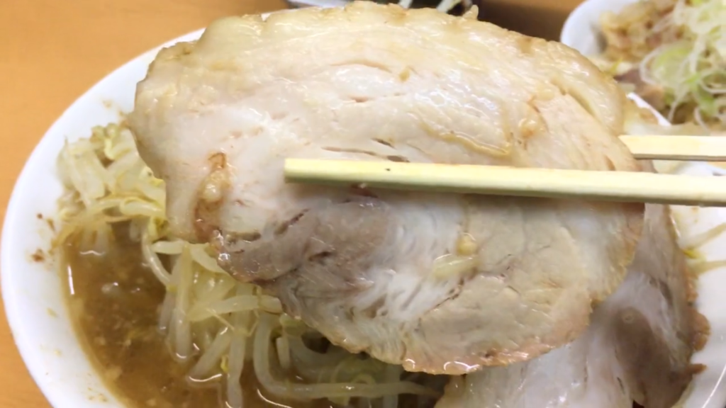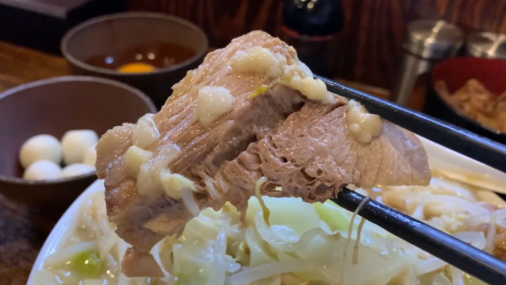 続いて厚切りのブタにかぶりつくと、肉肉しさを残しつつホロッと崩れる柔らかさが心地よく、ヤサイ・アブラ・ブタの三位一体で一気に満足度が跳ね上がります。