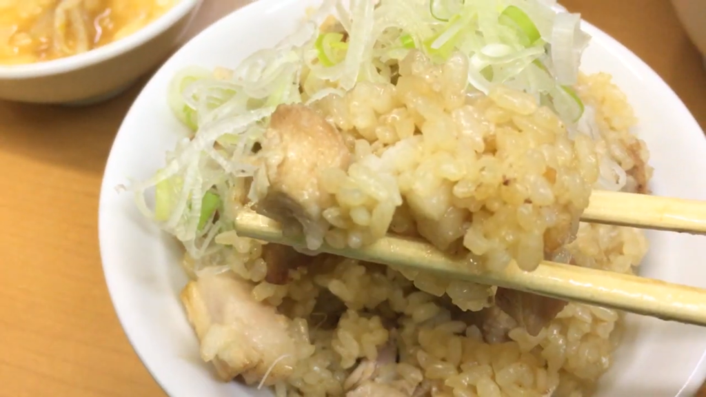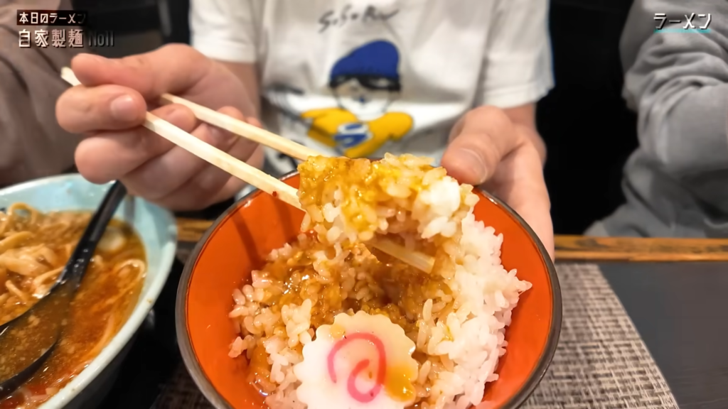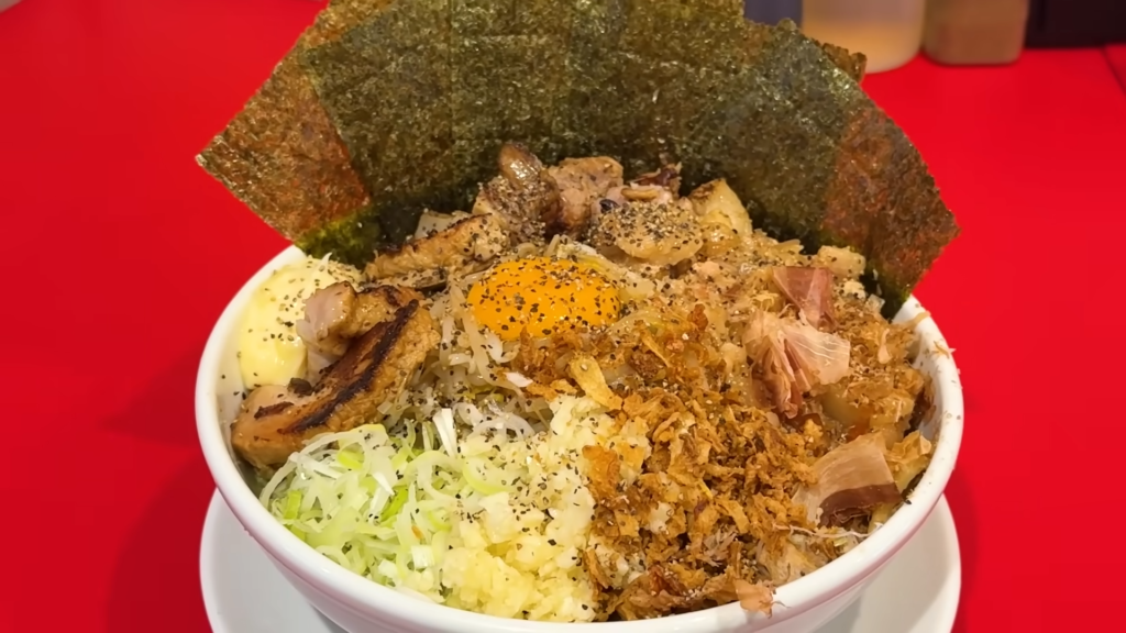 ここで満を持してごはんに手を伸ばし、残ったアブラやトッピングを豪快にオンしてカエシを回しかければ、背徳感あふれるアブラのせごはんが完成します。一口食べれば、濃厚な旨味が一気に押し寄せ、汁なしと並ぶ強烈な破壊力を発揮。