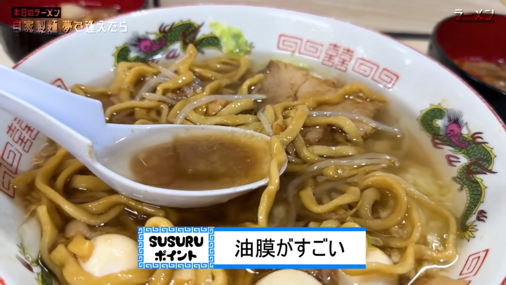 その麺に絡むスープは、液体油のパンチが前面に出たキレのある非乳化タイプで、極太麺と合わさることで一気に完成する設計。これは確かに、夢でも逢いたくなる系の麺だなと思いながら食べ進めていきます。