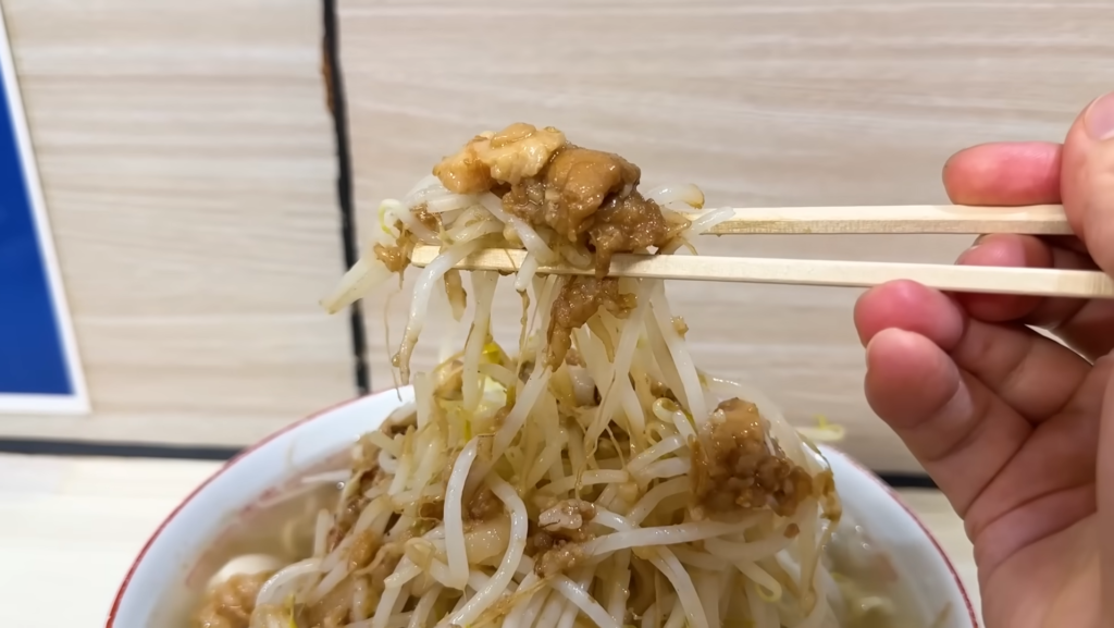 まずはヤサイから食べてみると、クタシャキ寄りのモヤシとキャベツに、味付きアブラのジャンキーな旨味がしっかり絡み、序盤から食べ応え十分な仕上がり。