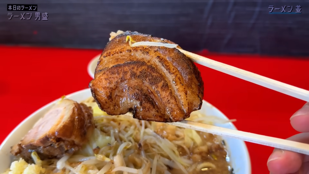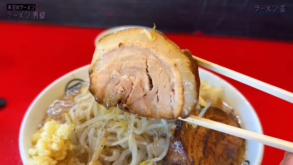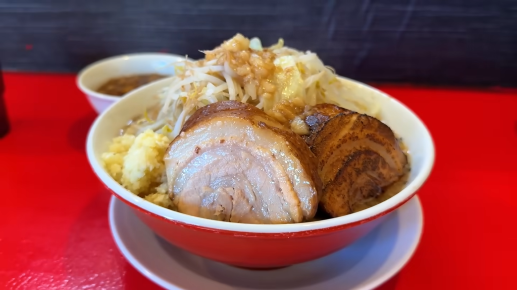 ヤサイの上にはアブラがしっかりとかかり、片方は炙りが入った分厚いブタが存在感を放ち、刻みニンニクもたっぷりと盛られた、王道の二郎系らしいビジュアルに仕上がっています。