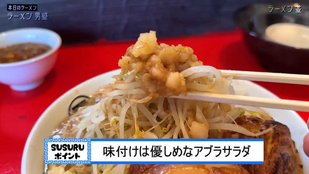 - ヤサイ、アブラは、程よくシャキ感を残しつつクタ寄りに仕上がったヤサイに、プレーンなアブラが絡み、安定感のあるアブラサラダとして完成度の高い味わいです!
