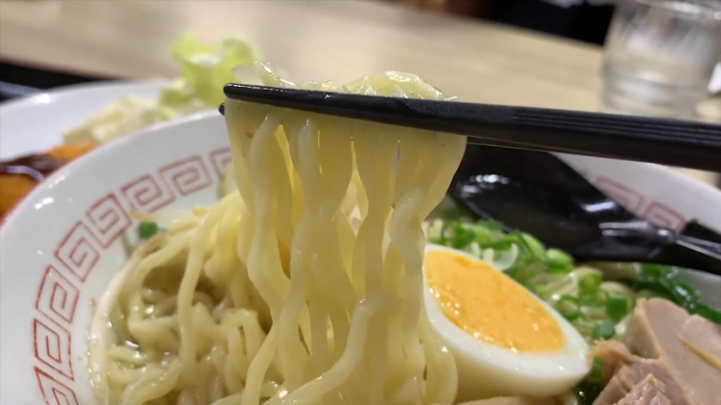 麺は中太タイプで、ほどよい弾力と存在感があり、スープに埋もれない太さで、噛みごたえを楽しめる設計です。