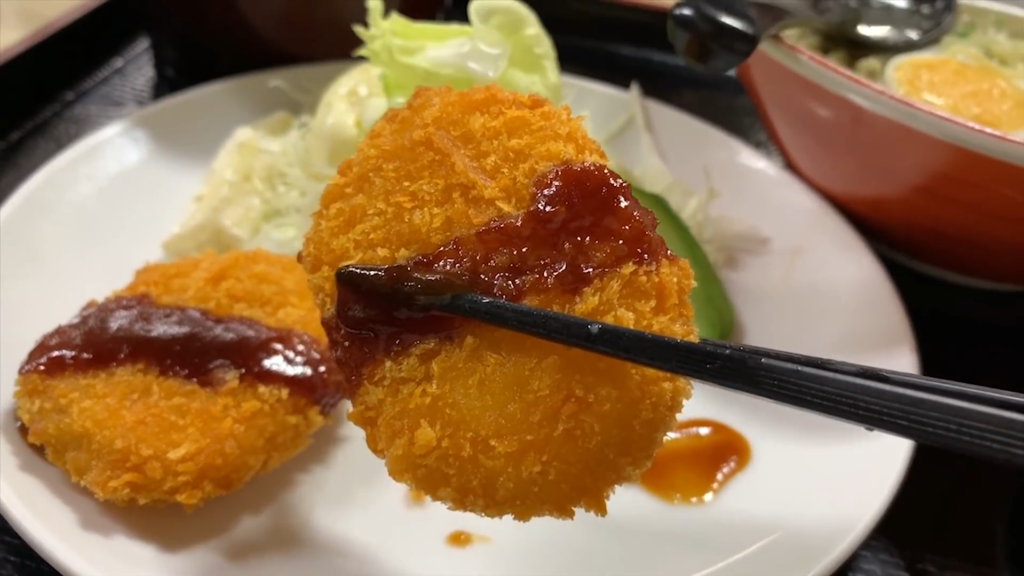 そしてコロッケへ。ひと口かじると、じゃがいもの甘みとほくほく感が広がり、ソースの風味が牛骨スープのやさしい甘みとコントラストを生みます。炭水化物と炭水化物の組み合わせながら、これが不思議と止まらない美味しさ。サラダで一息つきつつ、またラーメンへ戻ります。