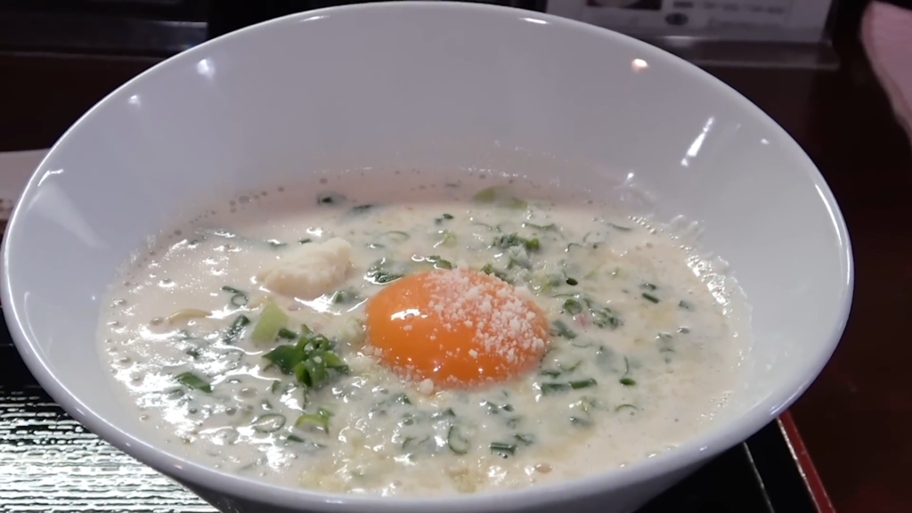 奥側が高くなった独特な形の丼に、チーズがかかった白濁スープ、中央には卵黄が鎮座。見るからにミルキーなビジュアルでテンションが上がります。